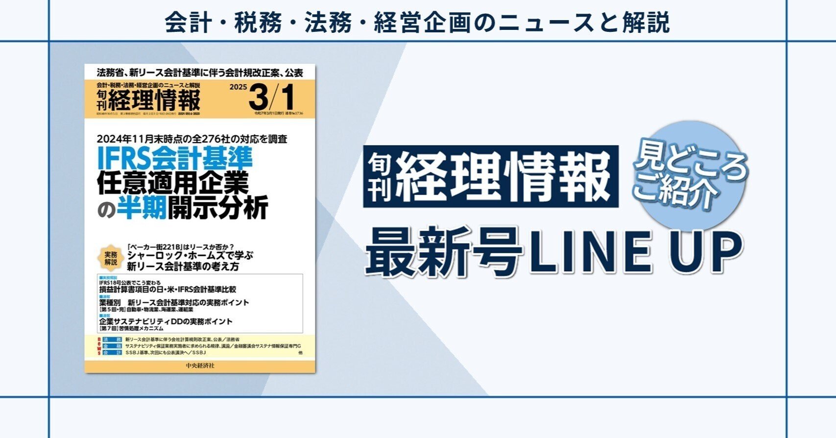 2月20日発売の旬刊『経理情報』3月1日号(№1736)の記事ラインアップをご紹介。 気になる記事がありましたら、ぜひご一読を! 定期購読は、こちらからお申し込みいただけます。 〔特集〕 2024年11月末時点の全276社の対応を調査 IF...